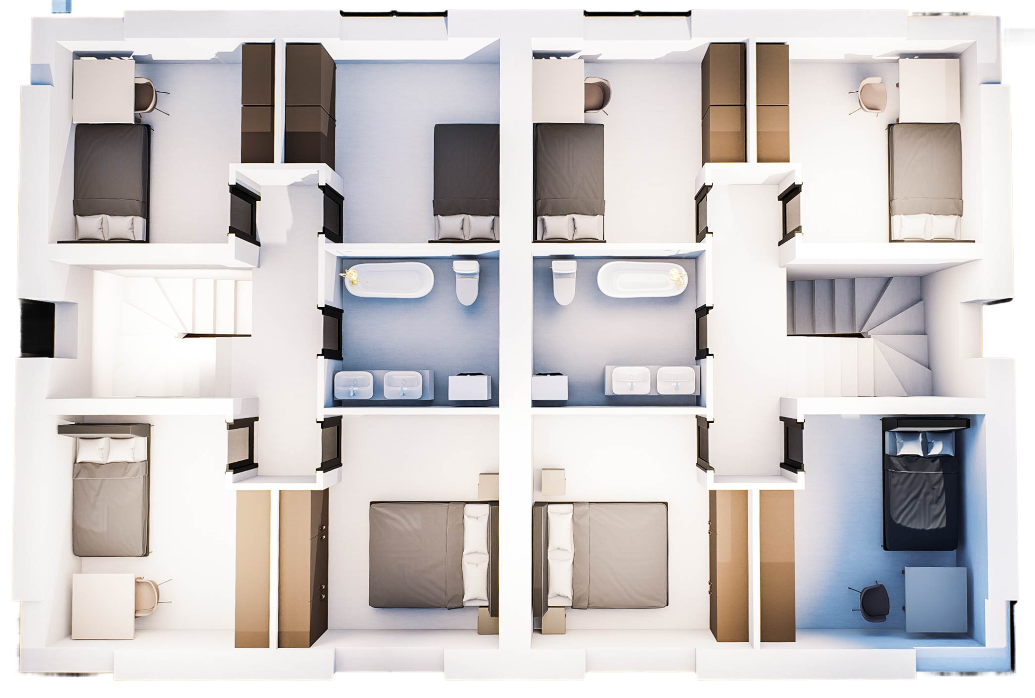 Zwei nahezu identische Häuser – Twin 1 und Twin 2 – bieten höchsten Wohnkomfort: mit eigener Zufahrt, privaten Gärten, großzügigen Terrassen und lichtdurchfluteten Wohnbereichen.